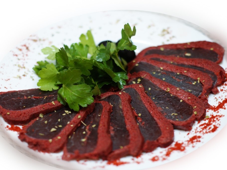 Описание: Бастурма - вяленая в пряностях говядина. Очень острая и пряная оболочка из специй, мясо очень нежное и легко режется. Продукт из говядины предназначен для употребления в пищу как в роли самостоятельного блюда, так и в качестве закуски.