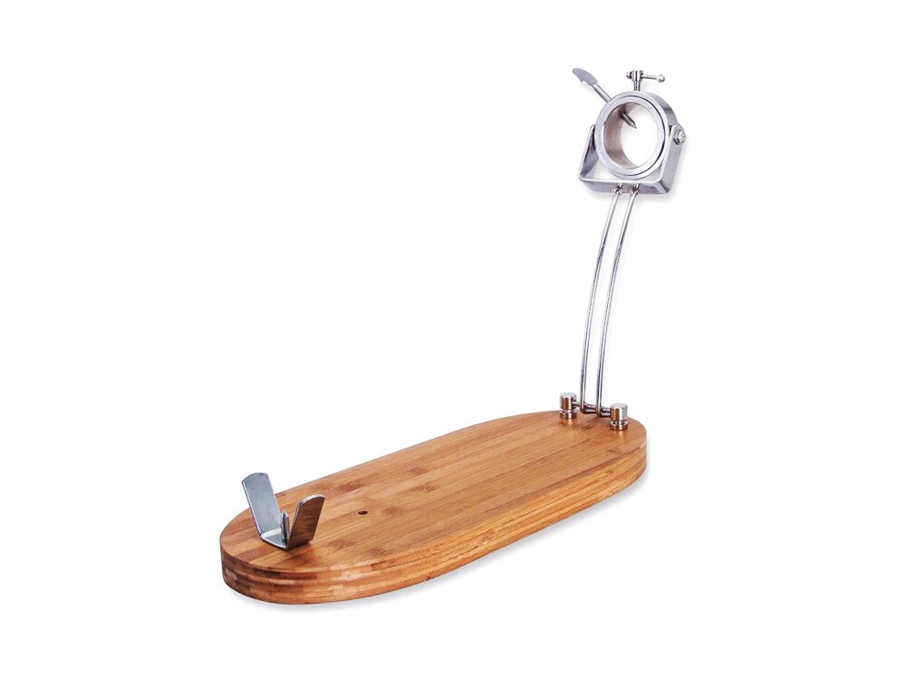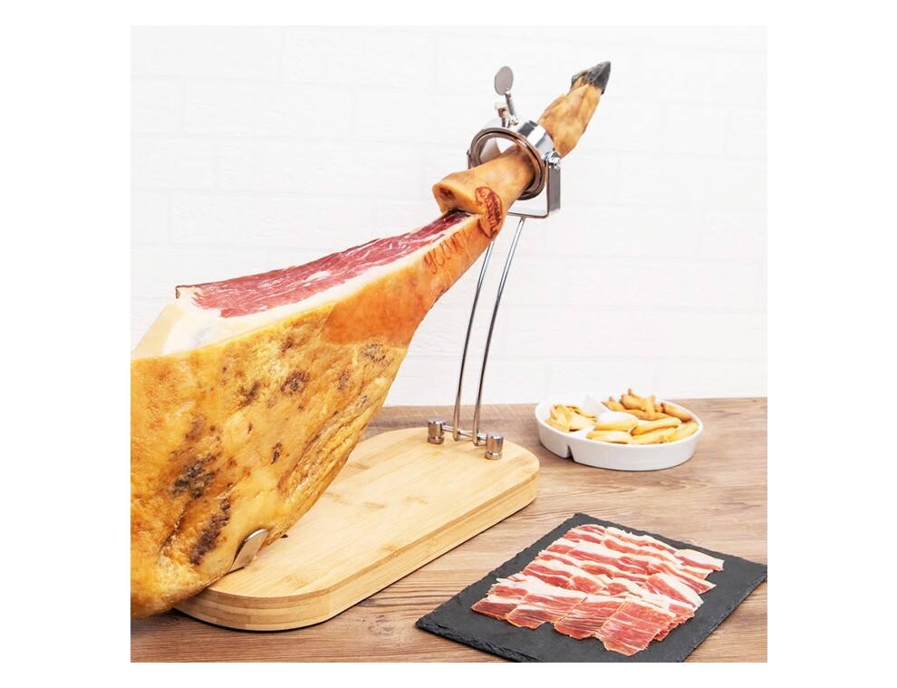 Описание: Подставка для хамона модель "Эль Падор" профессиональная. Данная модель очень компактная и уменьшается в размере в 2 раза за счёт складного механизма. Вращающаяся система позволяет поворачивать хамон без необходимости опускать ногу. Хамонера выполнена из бамбука и сверхпрочного металла.
