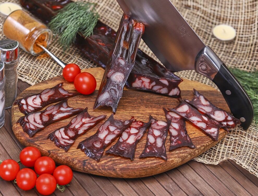 Описание: Колбаса из медведя обладает очень приятным сладковатым вкусов, схожим с курицей или свининой. Она изготавливается по специальному рецепту с добавлением пряных специй, которые подчеркивают незабываемый вкус дикого мяса. Данный деликатес содержит ценные витамины и является источником белка, фосфора, железа и других ценных микронутриентов.
