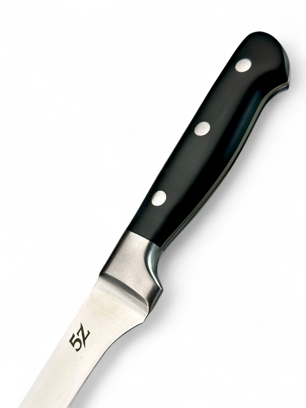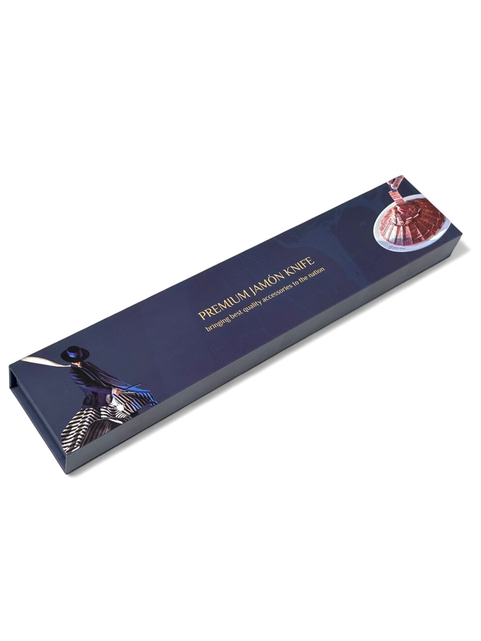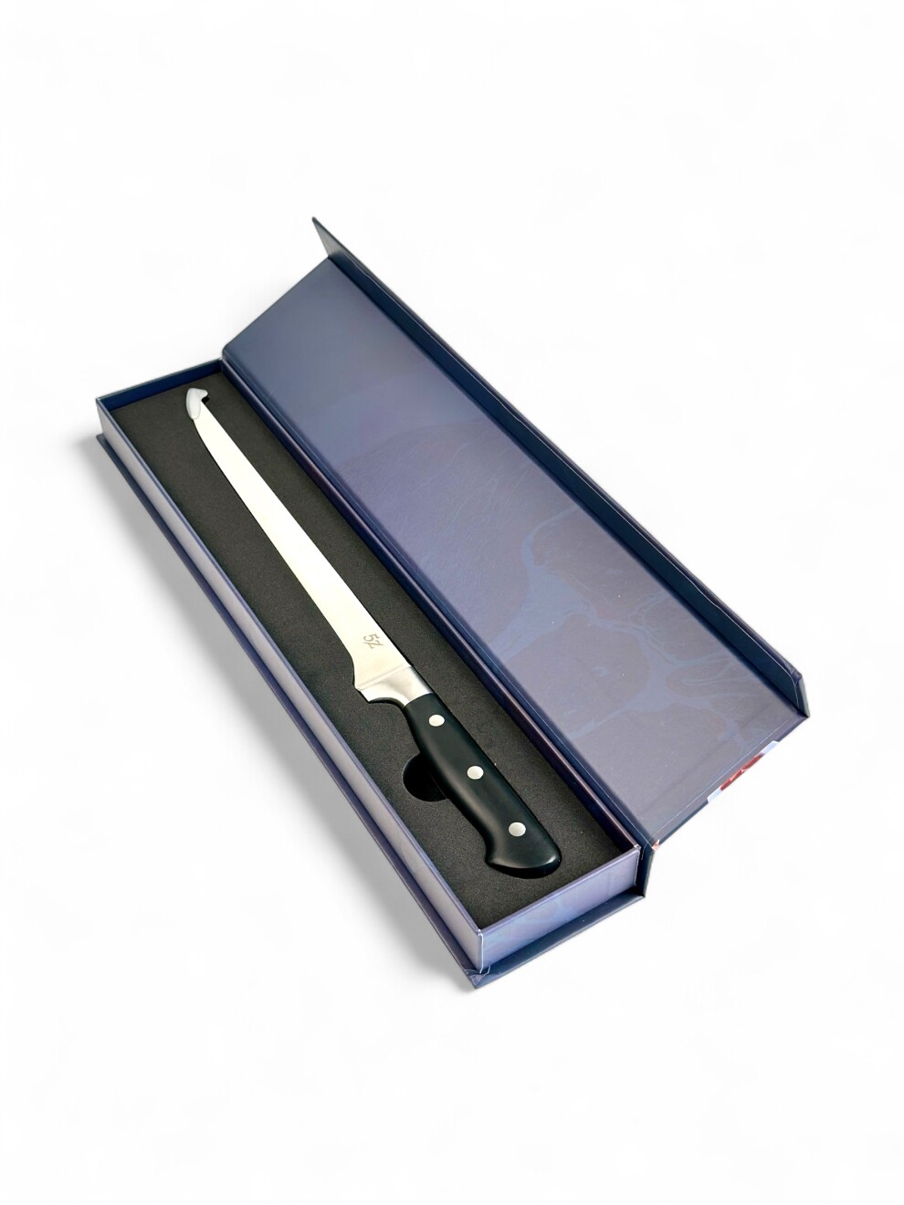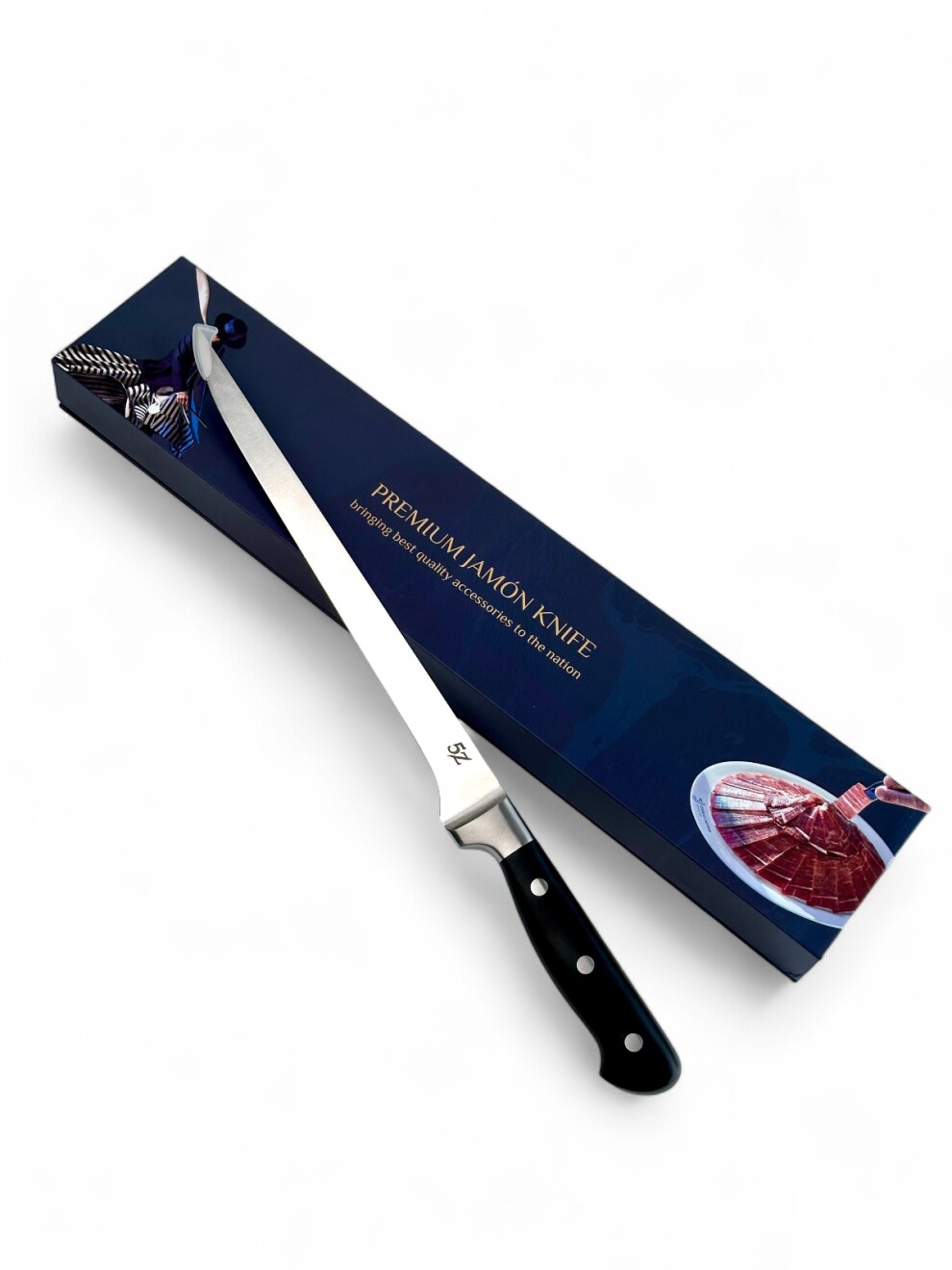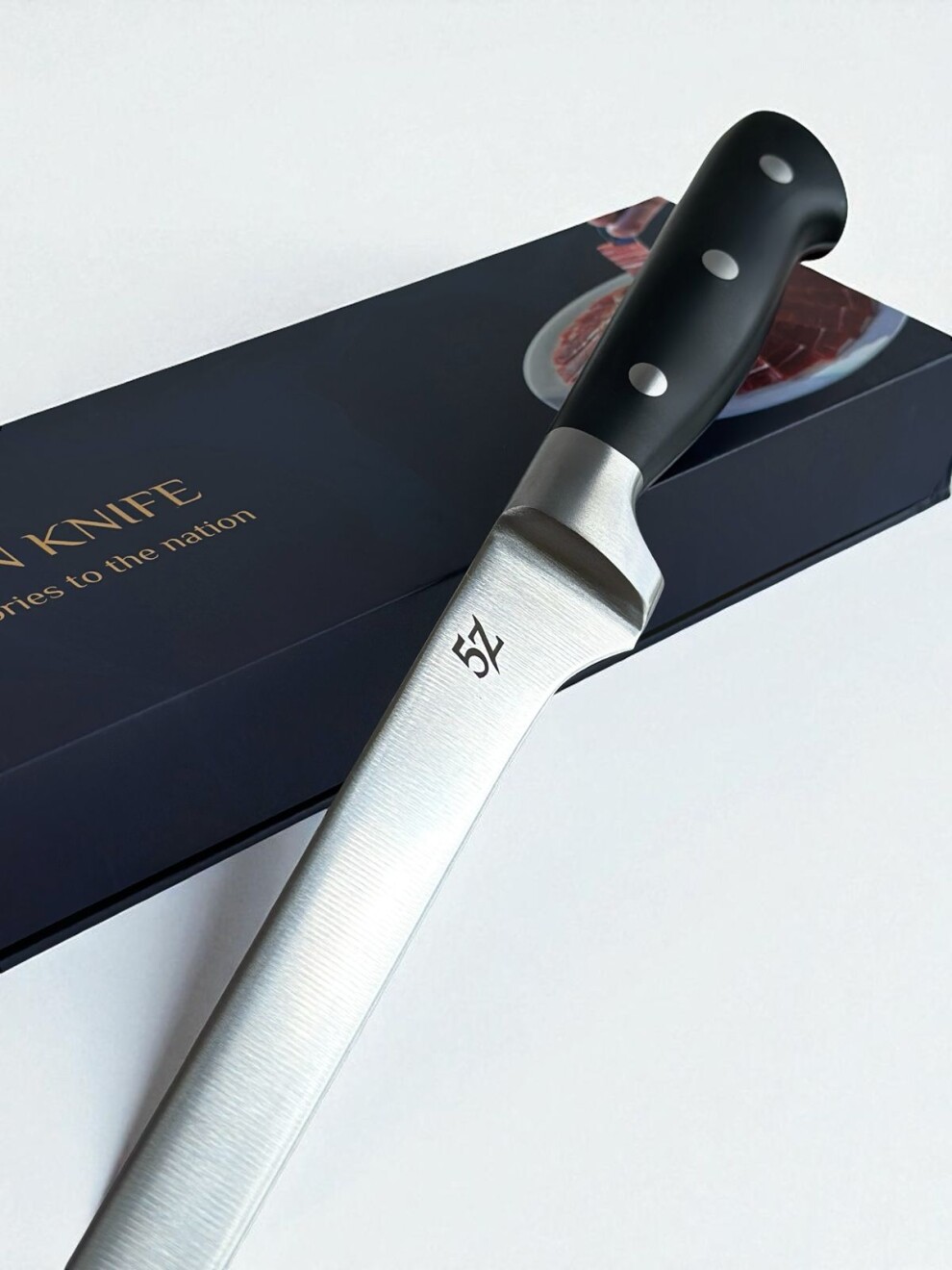 Описание: Профессиональный нож для хамона от бренда 5Z — мастер идеальной нарезки. Нож упакован в фирменную подарочную коробку. Точно выверенный баланс и острота превращают нарезку хамона в изящный ритуал.